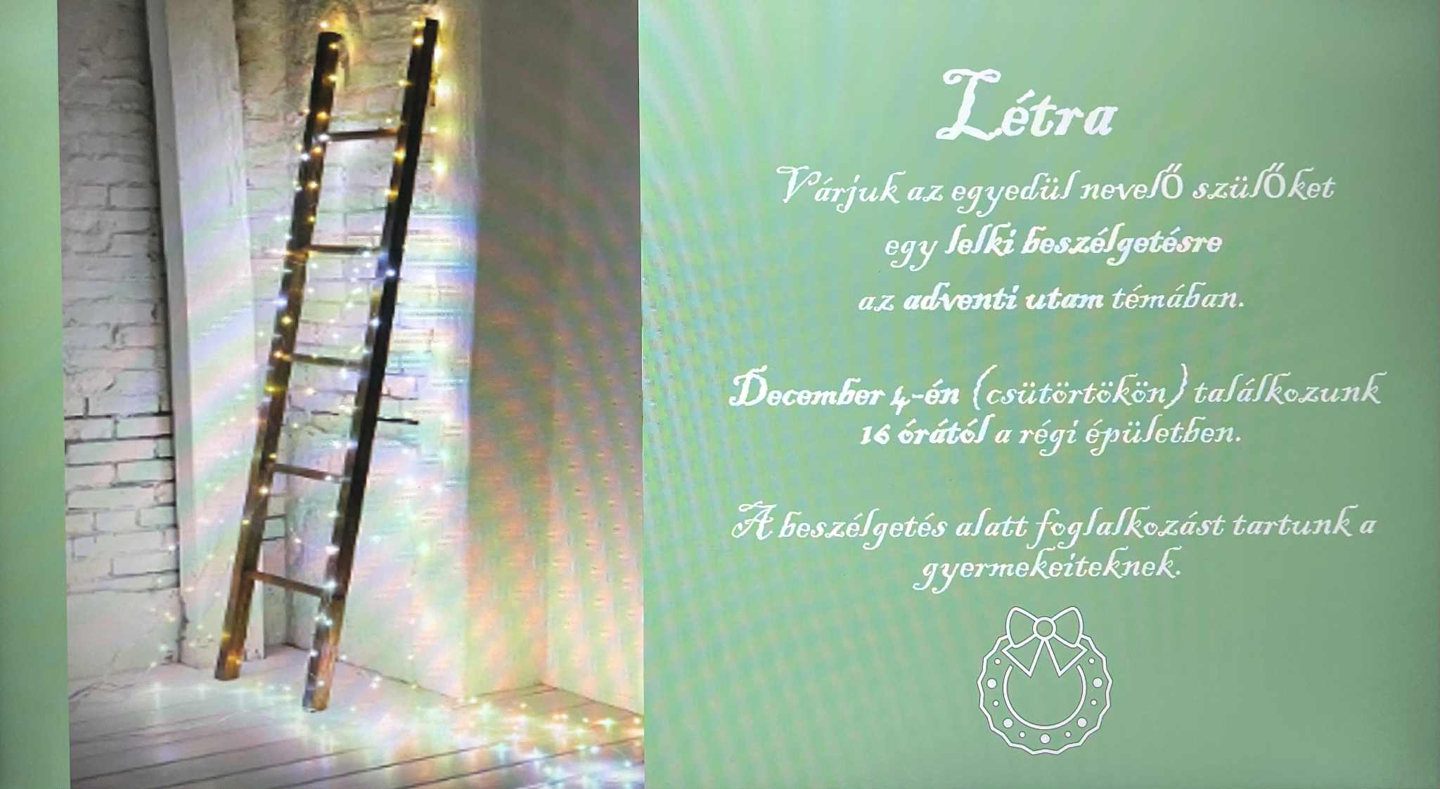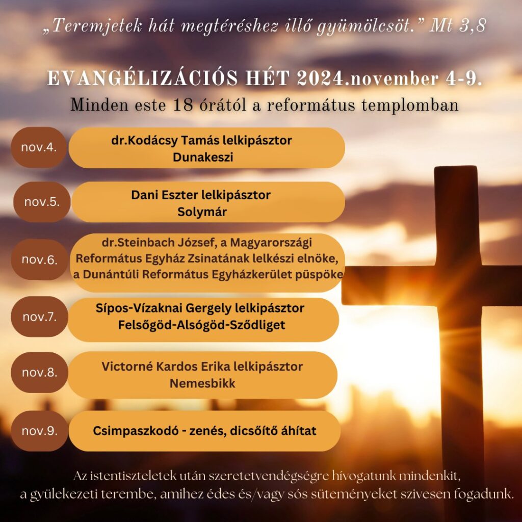nov 04-09 evangelizációs hét minden nap 18:00, utána szeretetvendégség, ahova köszönettel fogadunk édes és sós süteményeket