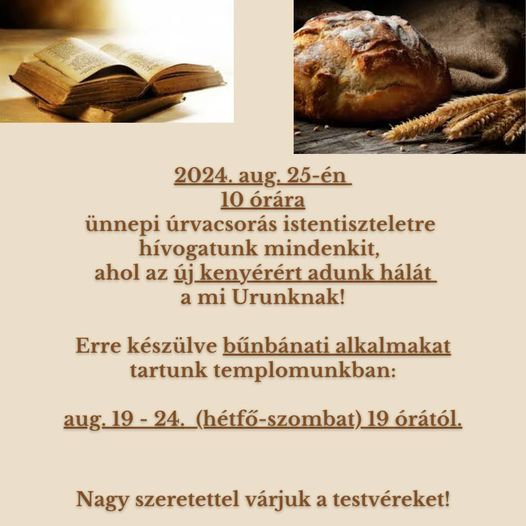 Aug 19-25 tartó héten bűnbánati alkalmak lesznek esténként, vasárnap úrvacsorás istentisztelet